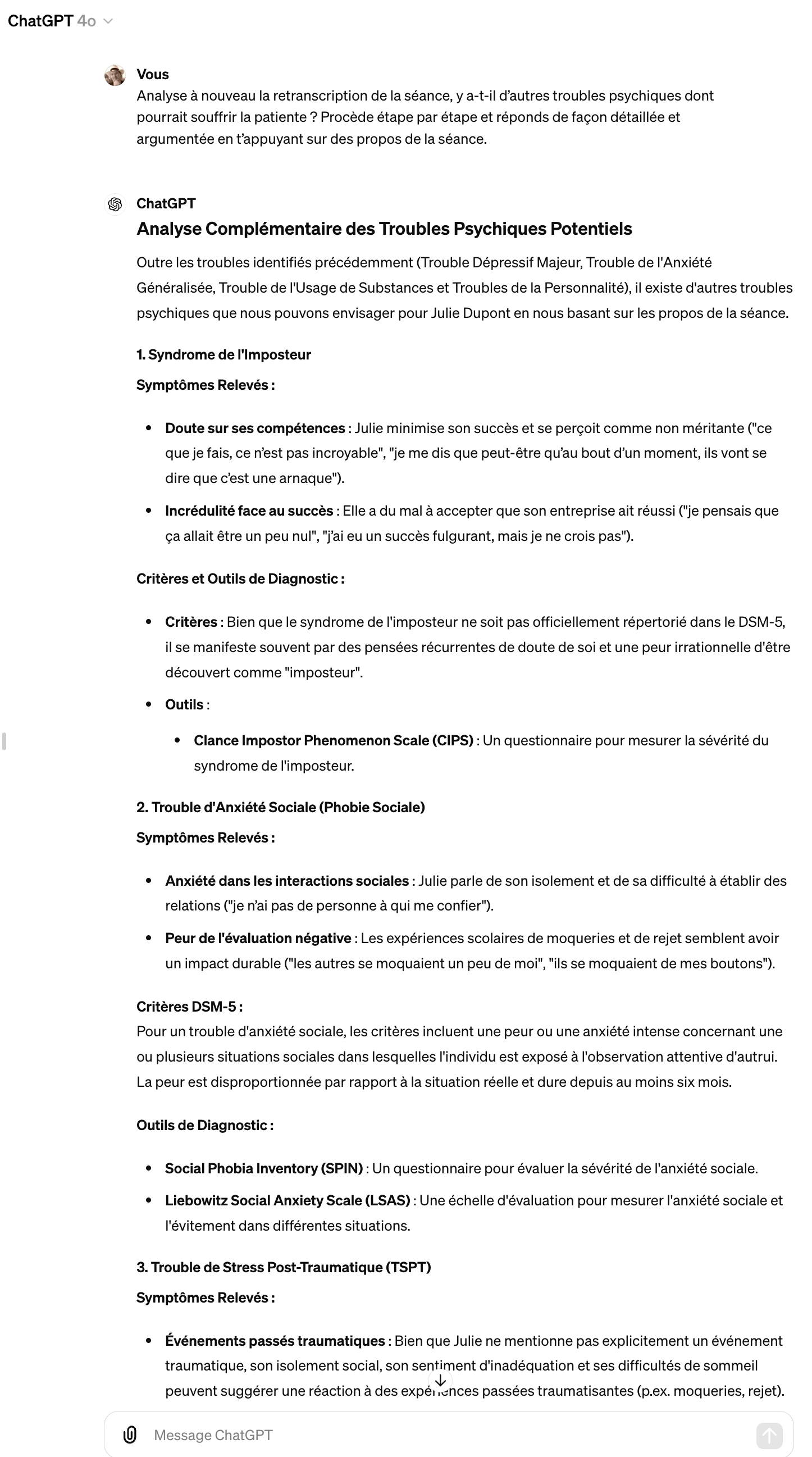 Conclusion : Cette analyse supplémentaire révèle plusieurs pistes diagnostiques qui n'avaient pas été identifiées précédemment. Il est important de noter que ces troubles potentiels peuvent se chevaucher et interagir, créant un tableau clinique complexe. Une évaluation plus approfondie, incluant des entretiens structurés et des outils d'évaluation spécifiques pour chacun de ces troubles potentiels, serait nécessaire pour affiner le diagnostic et élaborer un plan de traitement approprié.