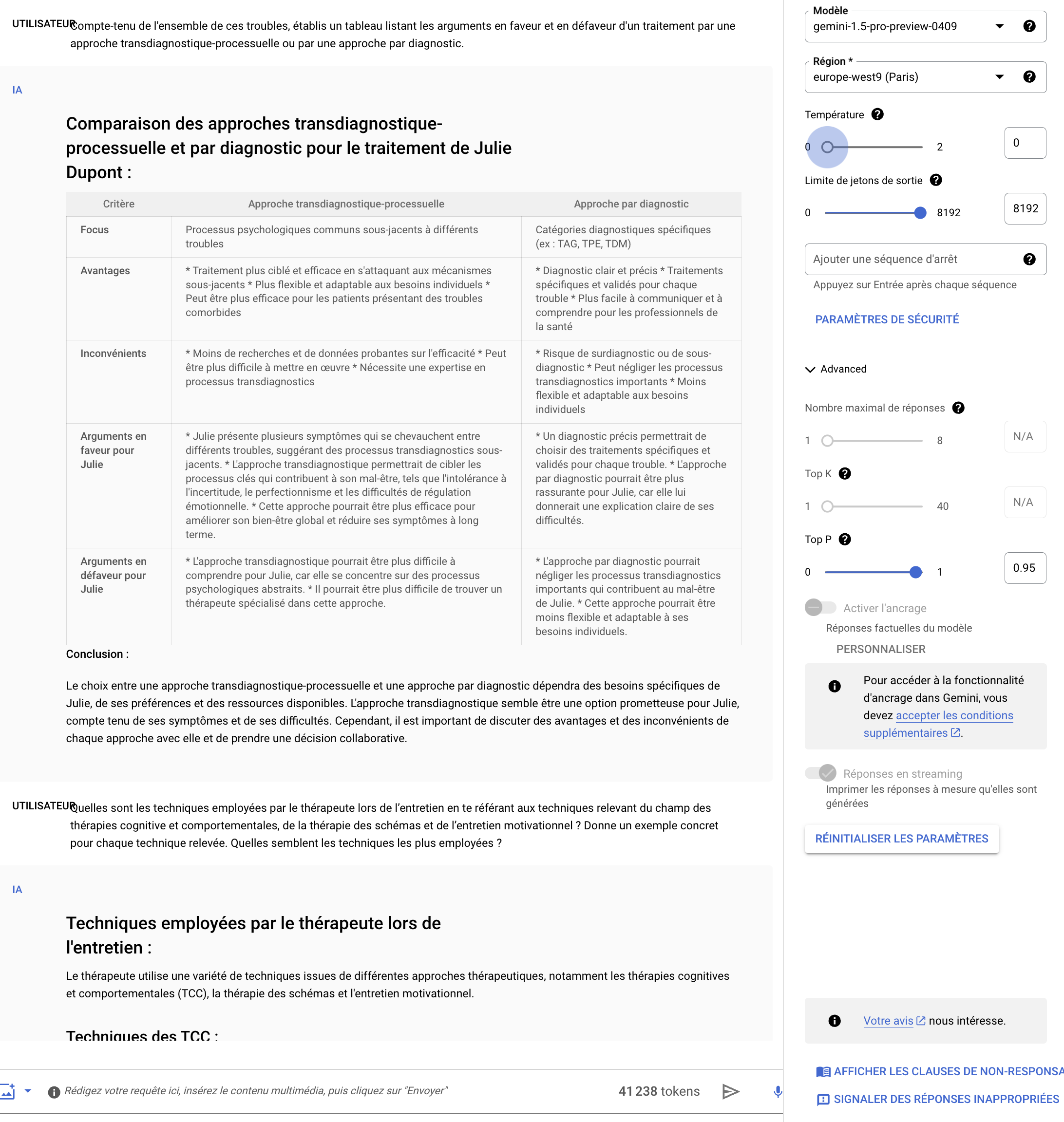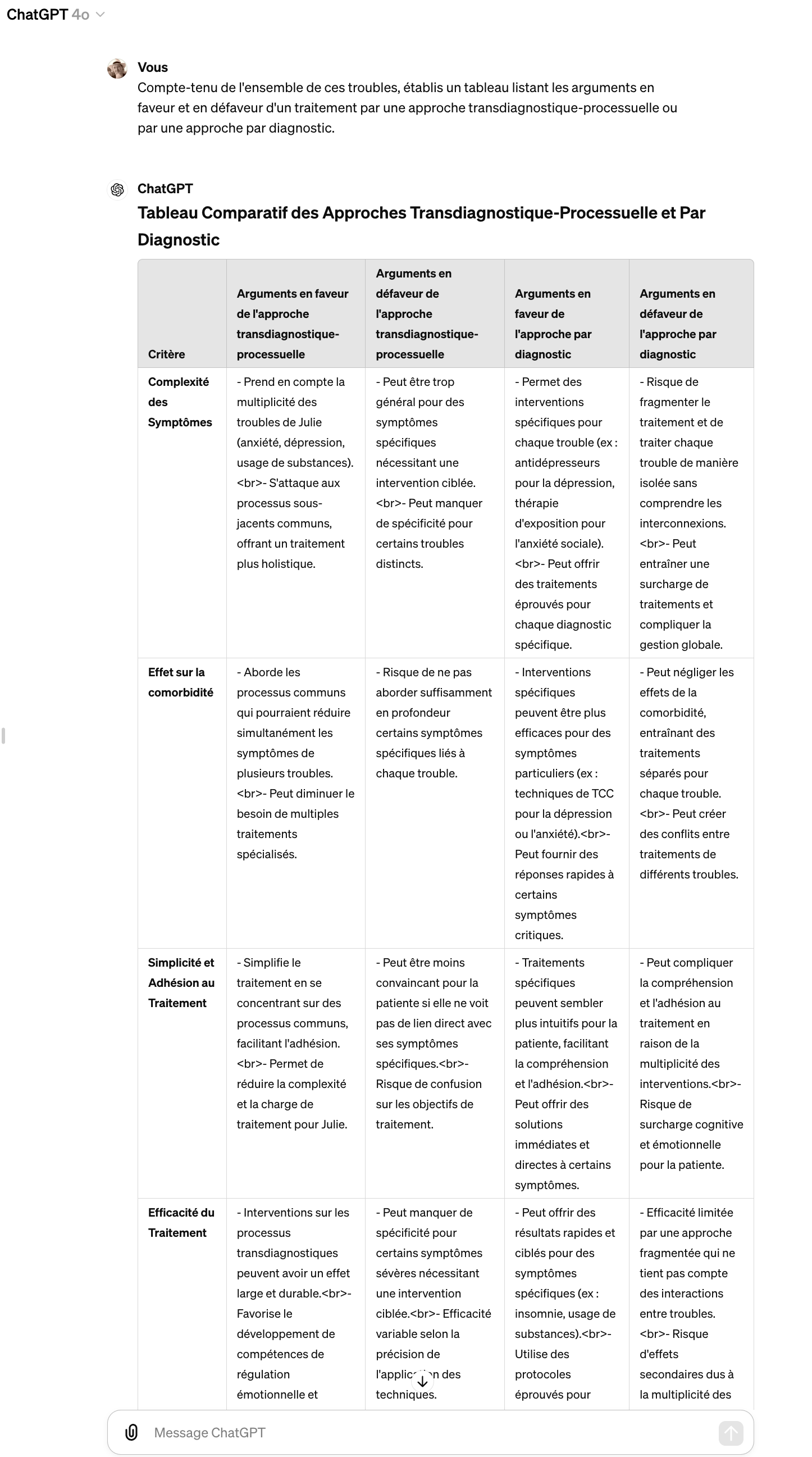 Capture d'écran de la réponseVoici un tableau comparatif des arguments en faveur et en défaveur d'un traitement par une approche transdiagnostique-processuelle ou par une approche par diagnostic pour le cas de Julie :