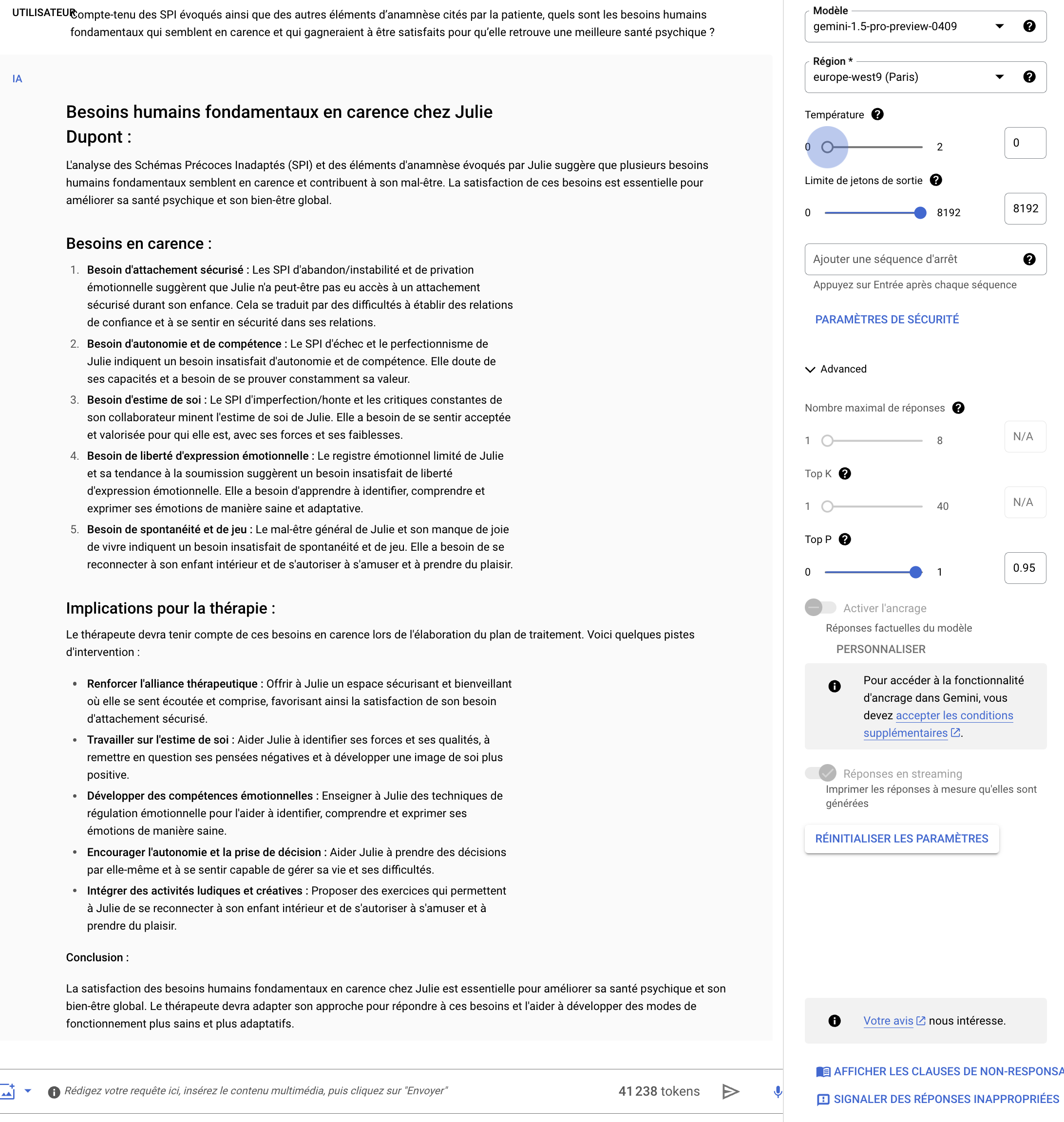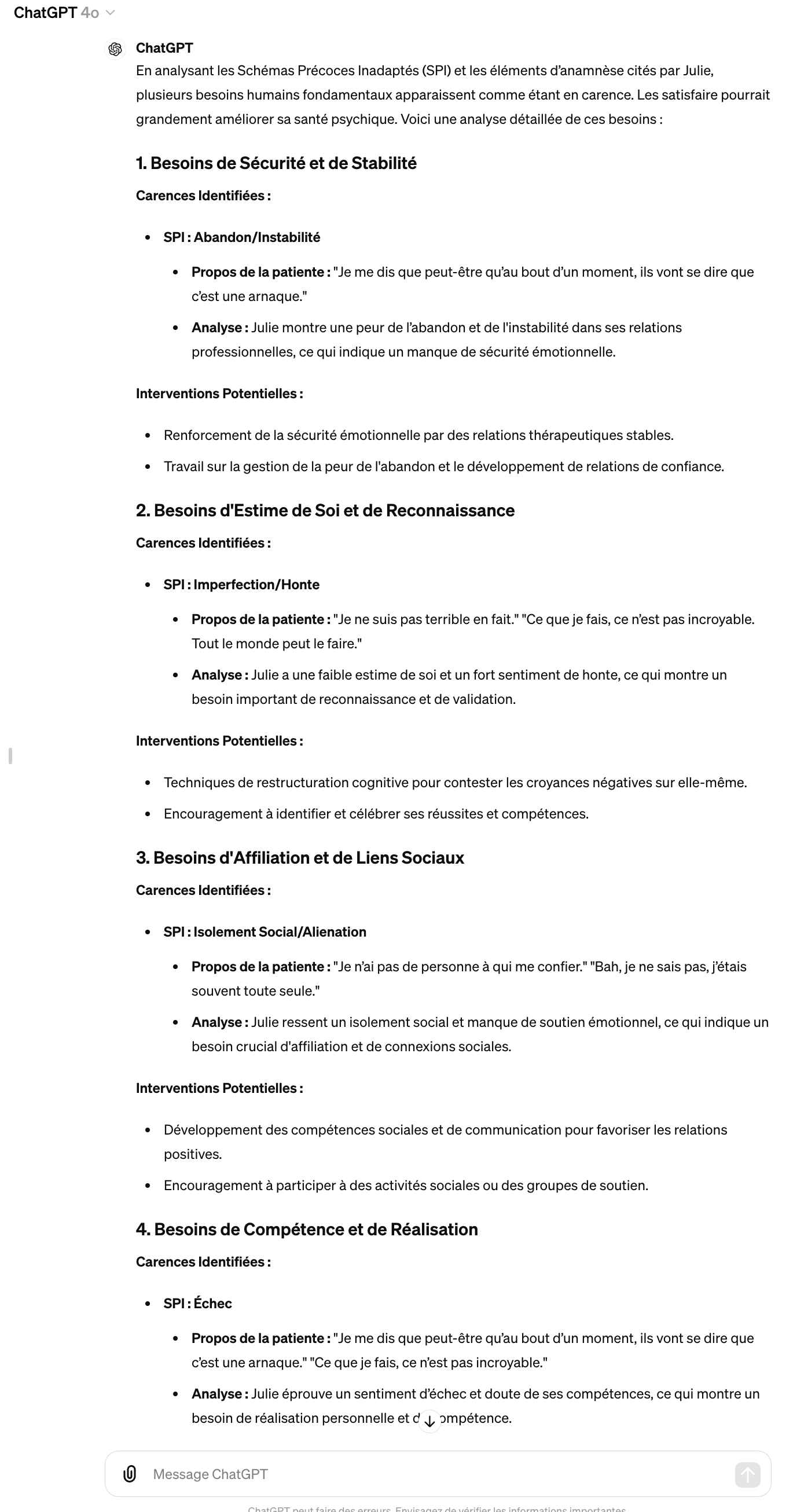 Capture d'écran de la réponseEn analysant les Schémas Précoces Inadaptés (SPI) identifiés chez Julie ainsi que les éléments d'anamnèse qu'elle a partagés, plusieurs besoins humains fondamentaux semblent être en carence. Voici une liste de ces besoins qui, s'ils étaient mieux satisfaits, pourraient contribuer à améliorer sa santé psychique :