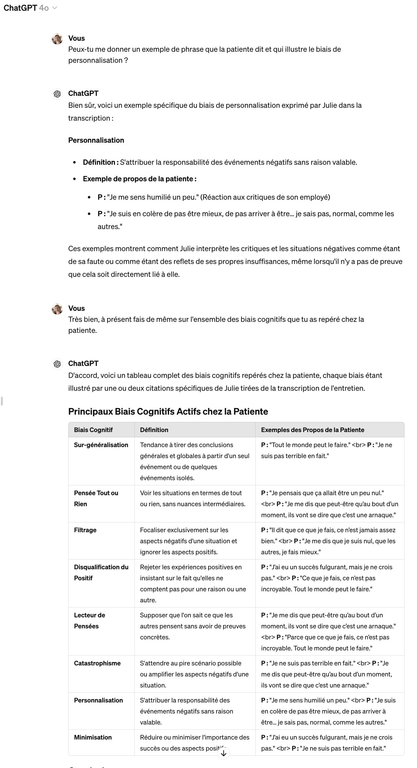 Très bien, à présent fais de même sur l'ensemble des biais cognitifs que tu as repéré chez la patiente.