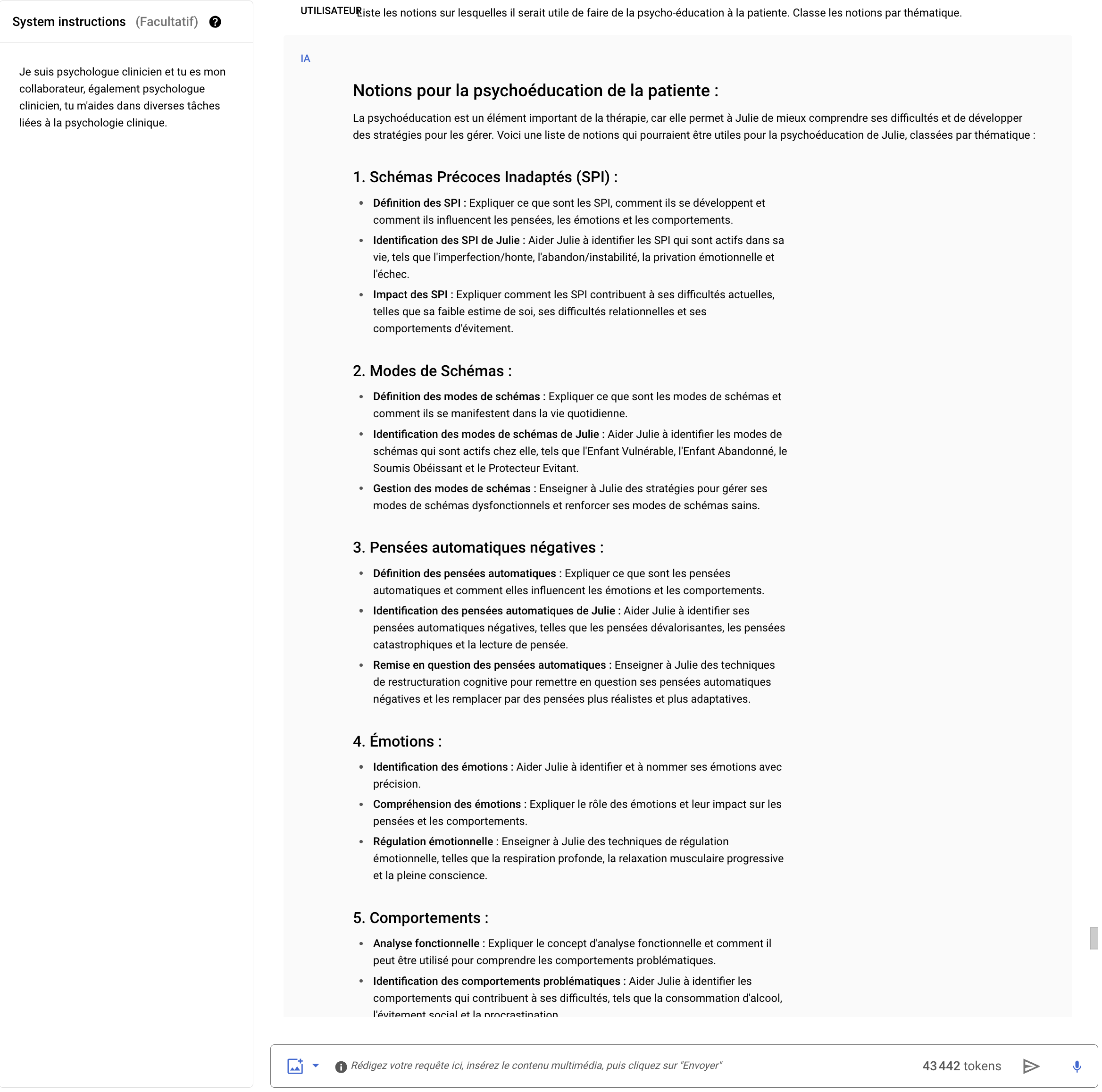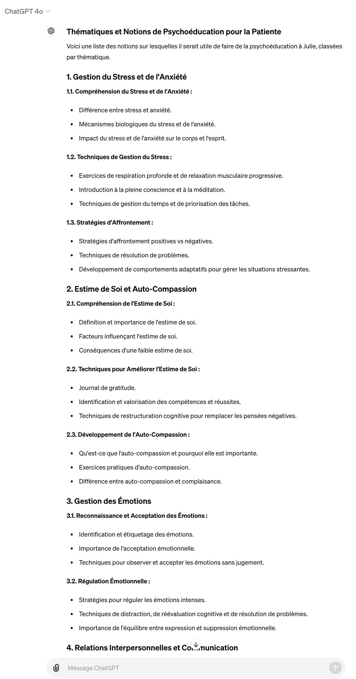 Capture d'écran de la réponseVoici une liste des notions sur lesquelles il serait utile de faire de la psycho-éducation à Julie, classées par thématique :
