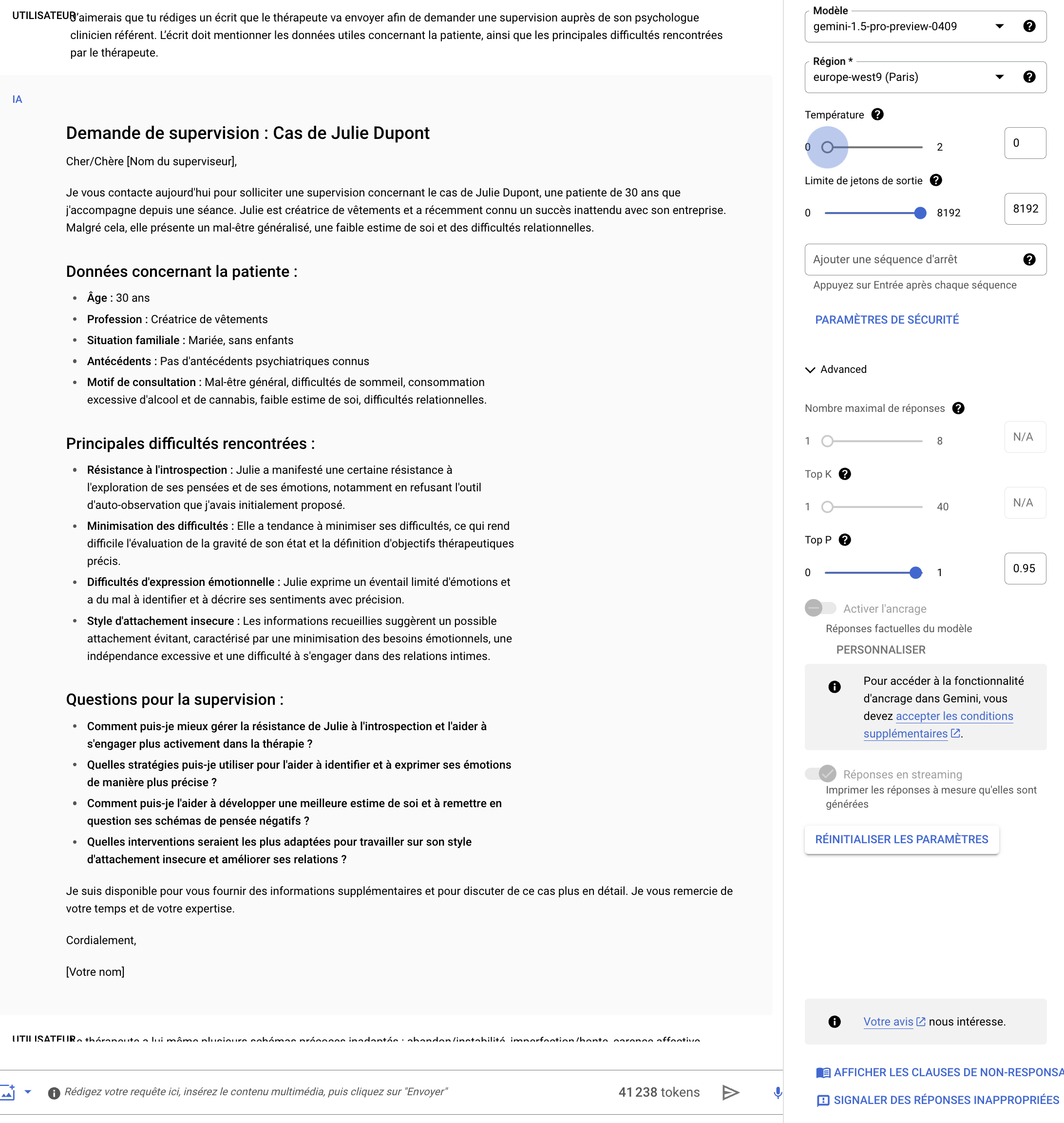 Capture d'écran de la réponseObjet : Demande de Supervision pour le Suivi Thérapeutique de Mme Julie Dupont
