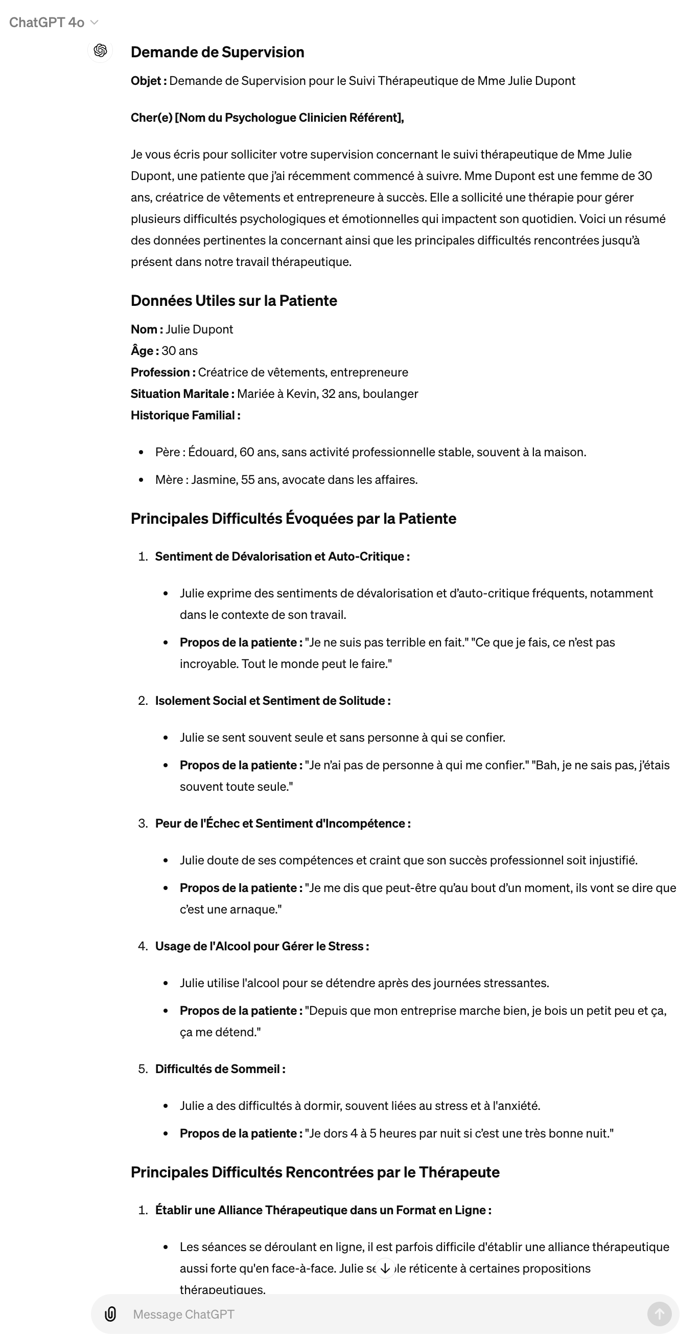 Je vous écris pour solliciter votre supervision concernant le suivi thérapeutique de Mme Julie Dupont, une patiente que j’ai récemment commencé à suivre. Mme Dupont est une femme de 30 ans, créatrice de vêtements et entrepreneure à succès. Elle a sollicité une thérapie pour gérer plusieurs difficultés psychologiques et émotionnelles qui impactent son quotidien. Voici un résumé des données pertinentes la concernant ainsi que les principales difficultés rencontrées jusqu’à présent dans notre travail thérapeutique.
