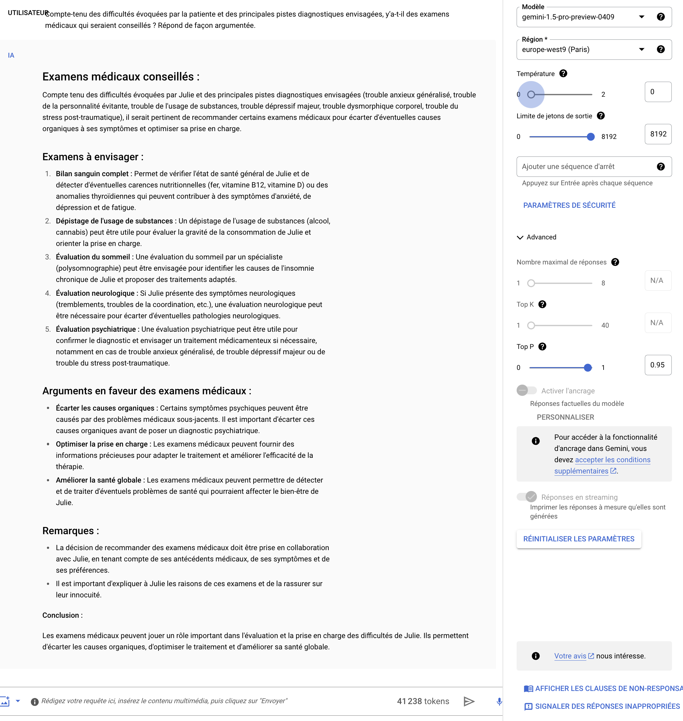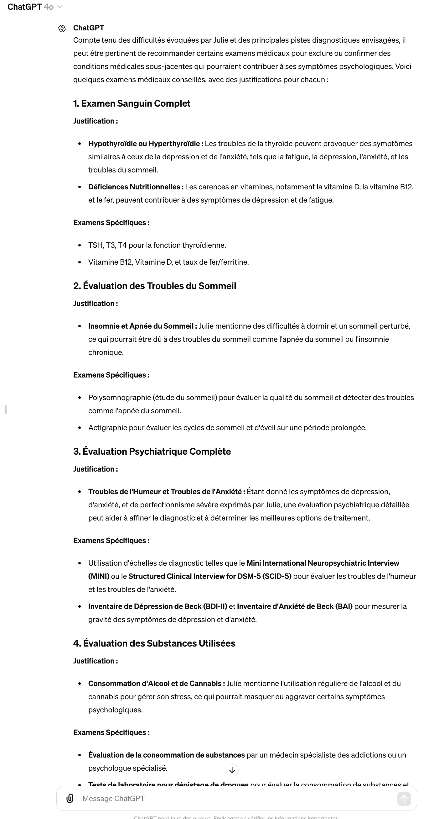 Capture d'écran de la réponseCompte tenu des difficultés évoquées par Julie et des principales pistes diagnostiques envisagées, il peut être pertinent de recommander certains examens médicaux pour exclure ou confirmer des conditions médicales sous-jacentes qui pourraient contribuer à ses symptômes psychologiques. Voici quelques examens médicaux conseillés, avec des justifications pour chacun :