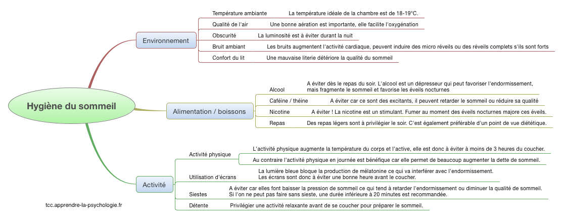 Les problèmes d'hygiène du sommeil sont très fréquemment présents dans les troubles du sommeil et sont des facteurs de maintien du problème. Pour les découvrir, on peut utiliser la Sleep Hygiene Practice Scale (SHPS) et également établir avec le patient une de ses journée type : repas, type de repas, activité principale, écran ou pas, télé dans la chambre ou pas, évaluer la consommation d'excitants (café, thé…), prise d’alcool combien, quand, fréquence, idem nicotine. Exercice physique, à quelle heure. Chambre à coucher : bruit, température de l’air qu’on respire (idéal environ 18-19°), aération car on hypoventile quand on dort, lumière. Qualité de la literie (importance du confort). Favoriser la fenêtre ouverte, mais s’il y a du bruit, peut-être pas (même 40 décibels provoquent une vasoconstriction donc augmentation du rythme cardiaque). Les principaux points de l'hygiène du sommeil sont résumés dans le schéma ci-dessous :Prise en charge comportementale