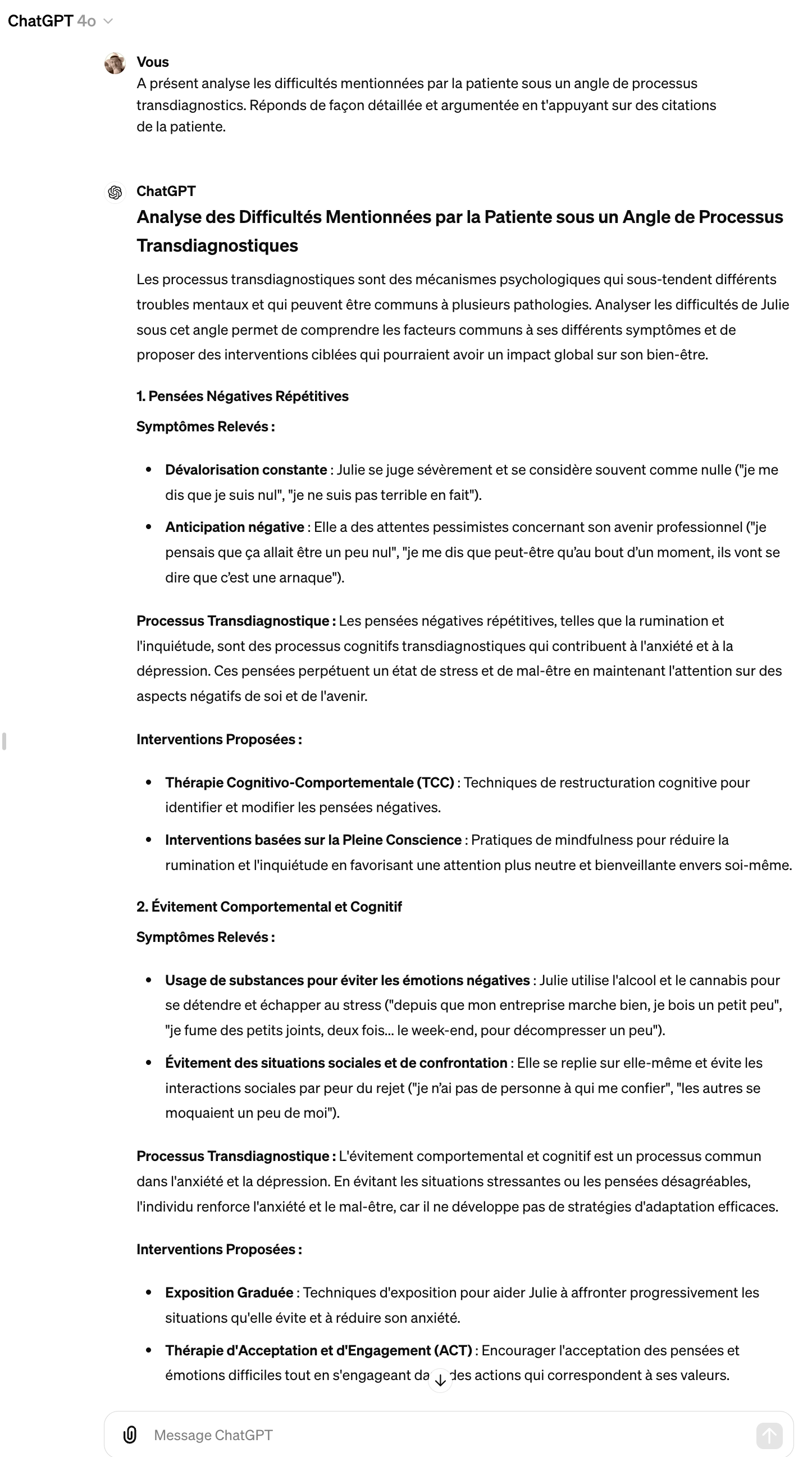 En conclusion, ces processus transdiagnostiques interagissent et se renforcent mutuellement, créant un cycle de mal-être psychologique. Une approche thérapeutique ciblant ces processus, plutôt que des symptômes spécifiques, pourrait être particulièrement bénéfique pour Julie. Cela pourrait inclure des techniques de régulation émotionnelle, de restructuration cognitive, de pleine conscience, et de développement de l'affirmation de soi, entre autres.