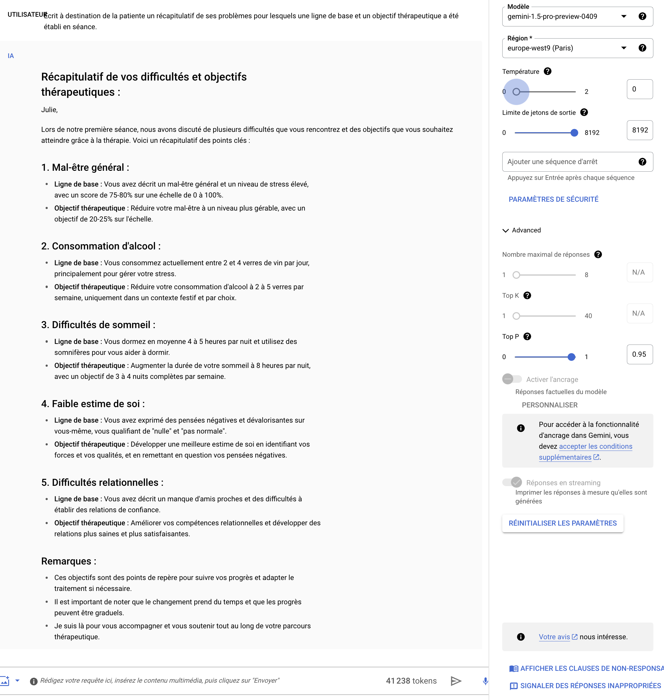 Vous êtes ici : Apprendre les TCC / Supervision thérapeutique par IA / Analyse par Intelligence Artificielle de la séance de Psychothérapie / Ligne de base et objectifs thérapeutiques