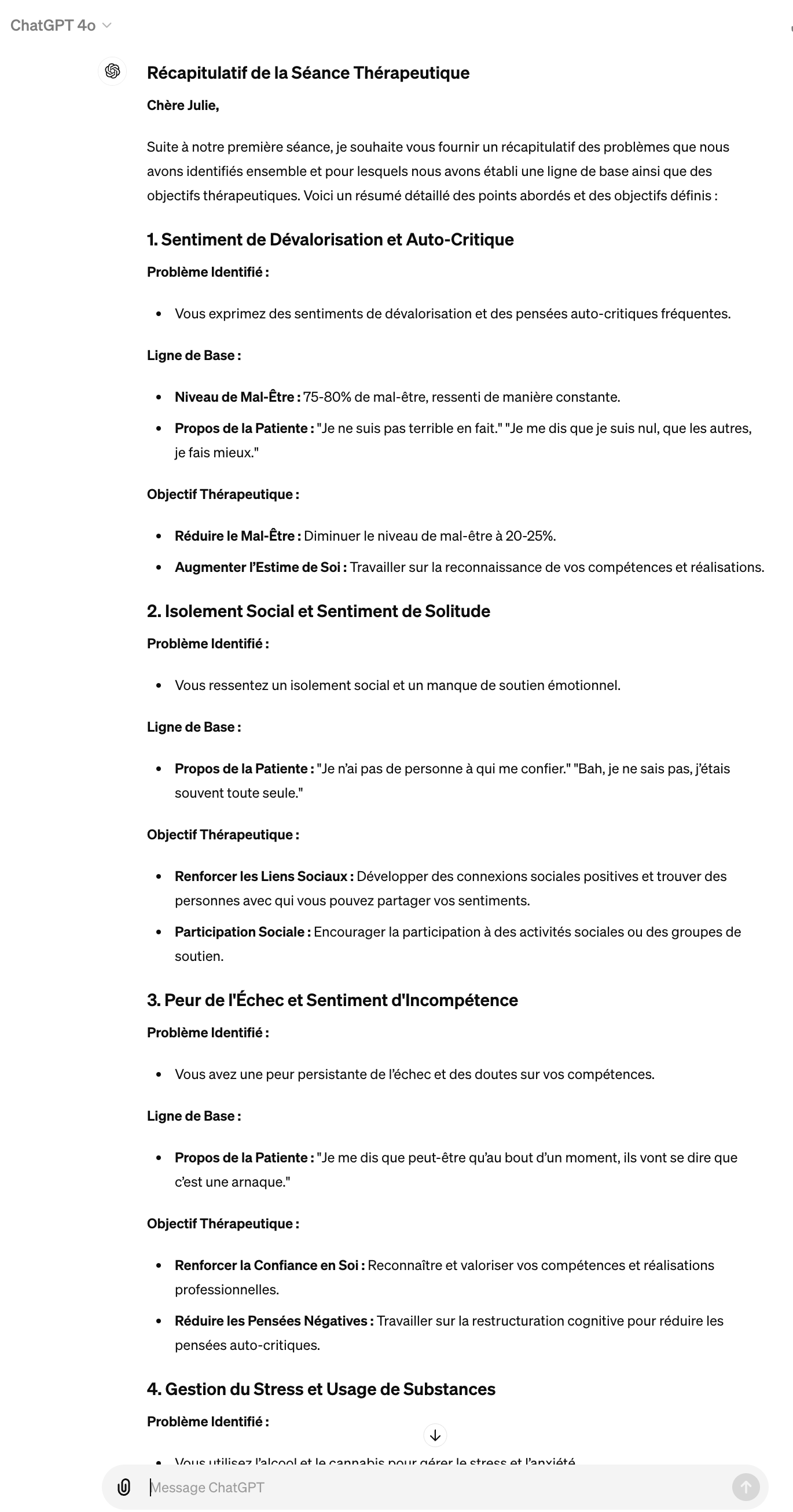 Suite à notre première séance, je souhaite vous fournir un récapitulatif des problèmes que nous avons identifiés ensemble et pour lesquels nous avons établi une ligne de base ainsi que des objectifs thérapeutiques. Voici un résumé détaillé des points abordés et des objectifs définis :