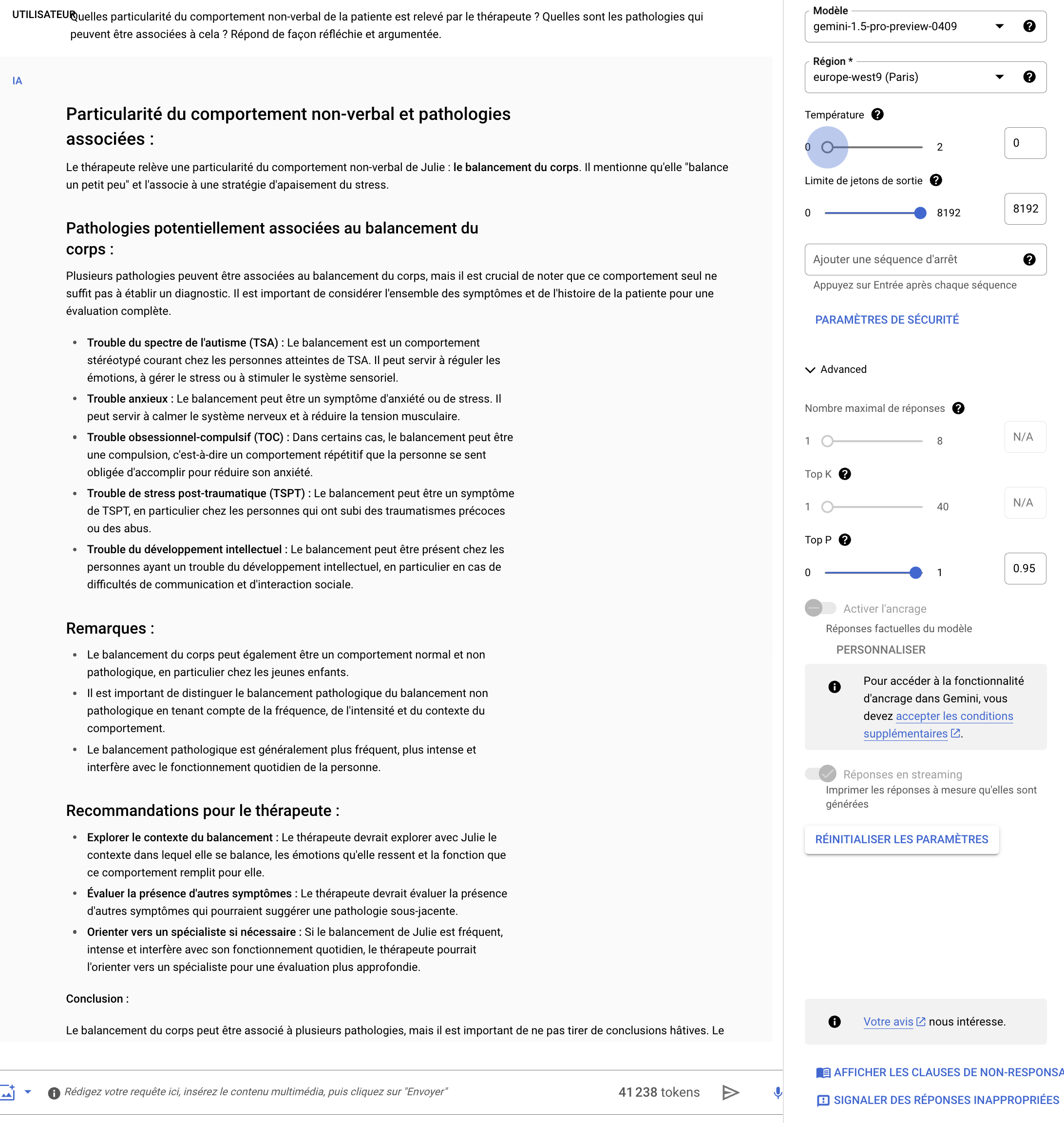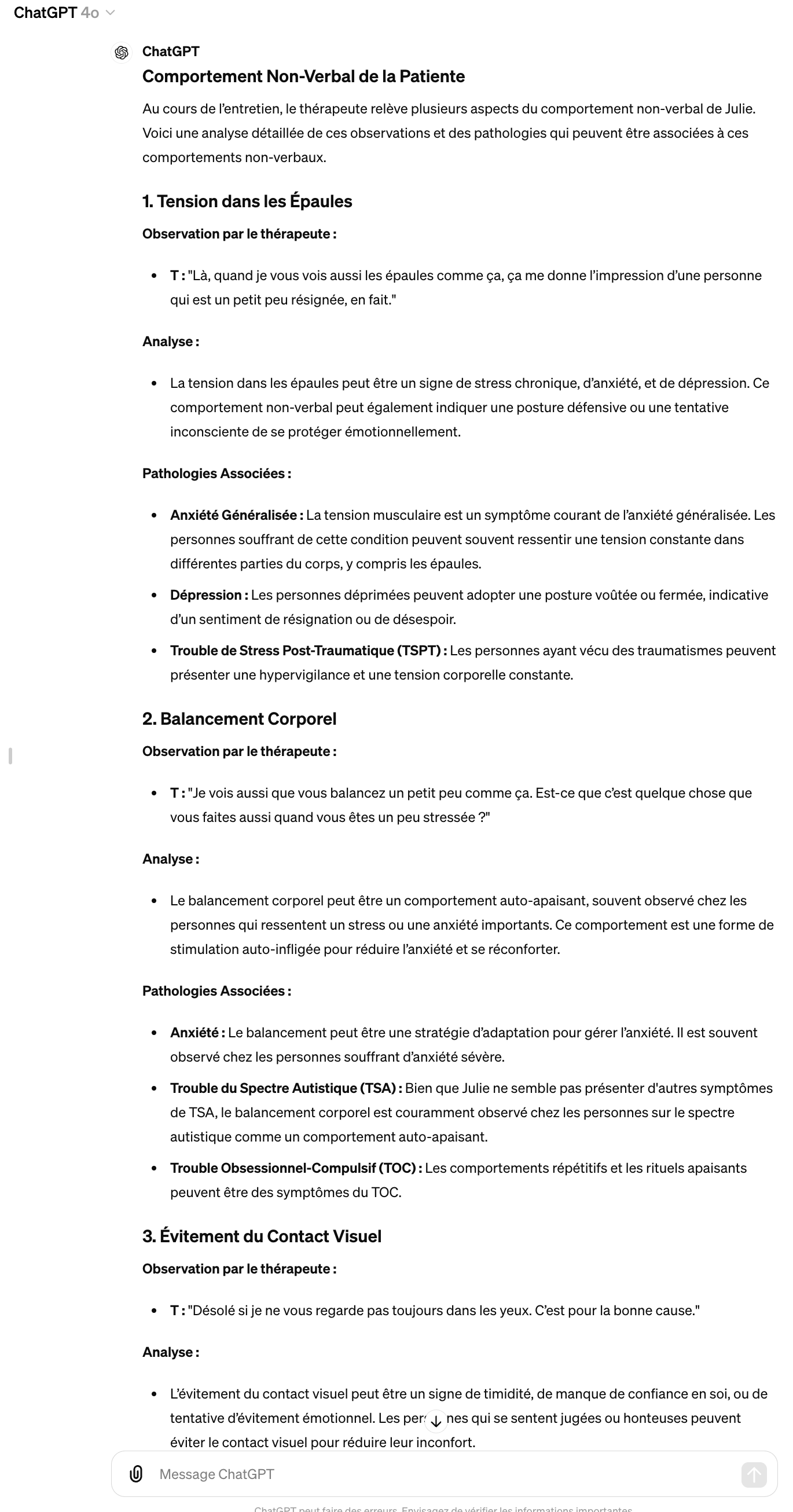Capture d'écran de la réponseAu cours de l’entretien, le thérapeute relève plusieurs aspects du comportement non-verbal de Julie. Voici une analyse détaillée de ces observations et des pathologies qui peuvent être associées à ces comportements non-verbaux.