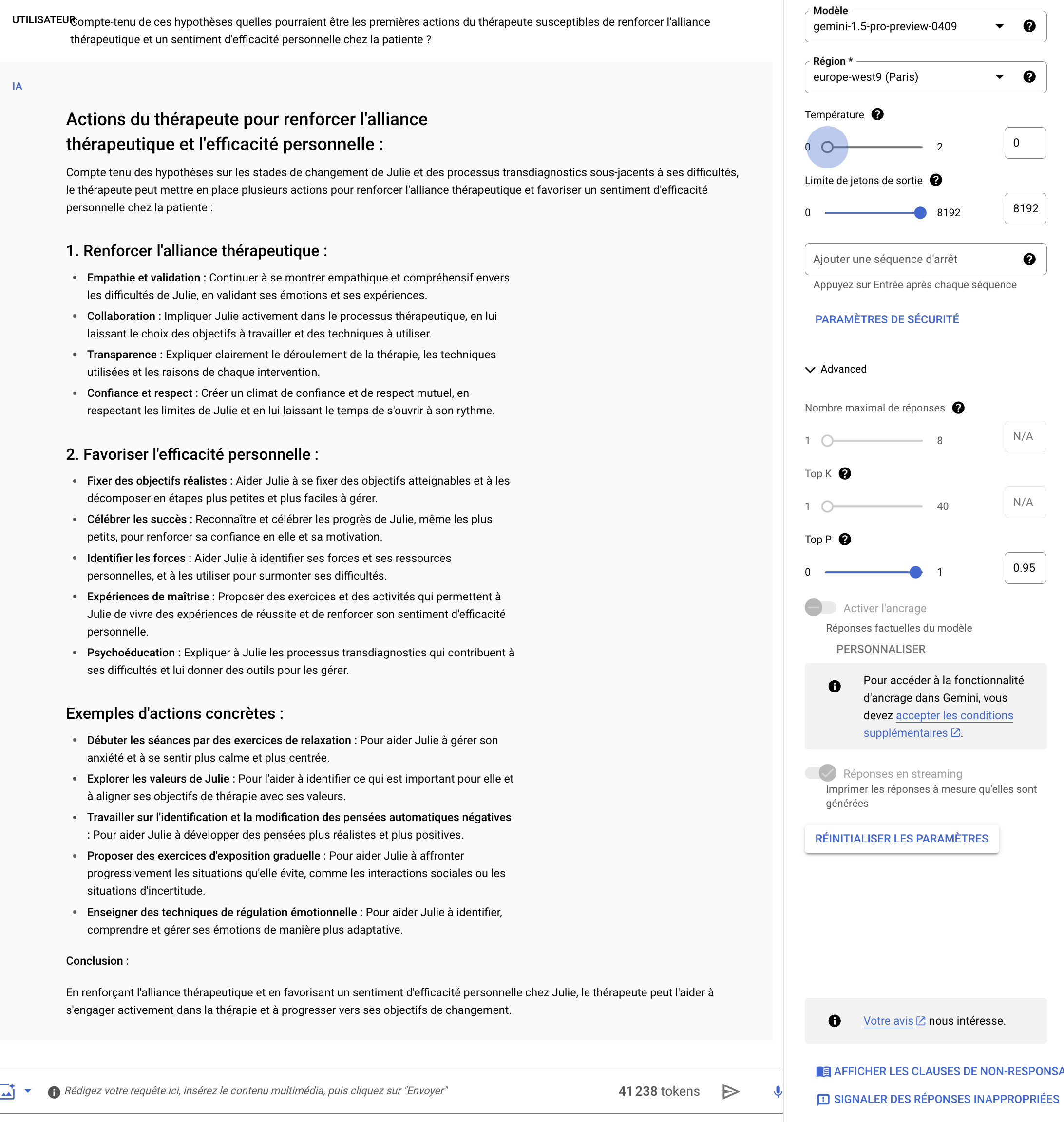 Capture d'écran de la réponseCompte tenu des différents stades de changement identifiés pour Julie, voici quelques suggestions d'actions que le thérapeute pourrait entreprendre pour renforcer l'alliance thérapeutique et développer un sentiment d'efficacité personnelle chez la patiente :