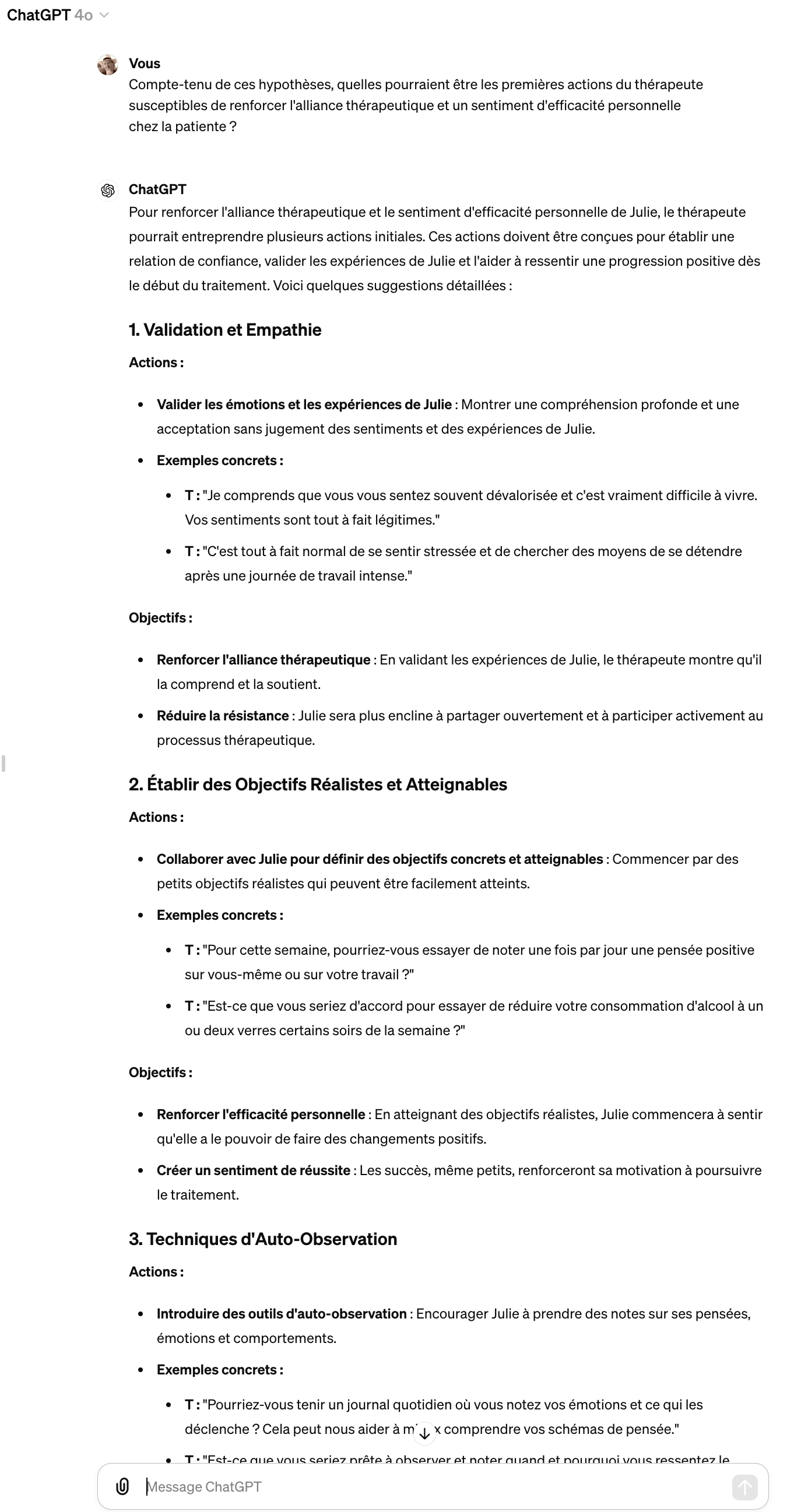 Pour renforcer l'alliance thérapeutique et le sentiment d'efficacité personnelle de Julie, le thérapeute pourrait entreprendre plusieurs actions initiales. Ces actions doivent être conçues pour établir une relation de confiance, valider les expériences de Julie et l'aider à ressentir une progression positive dès le début du traitement. Voici quelques suggestions détaillées :