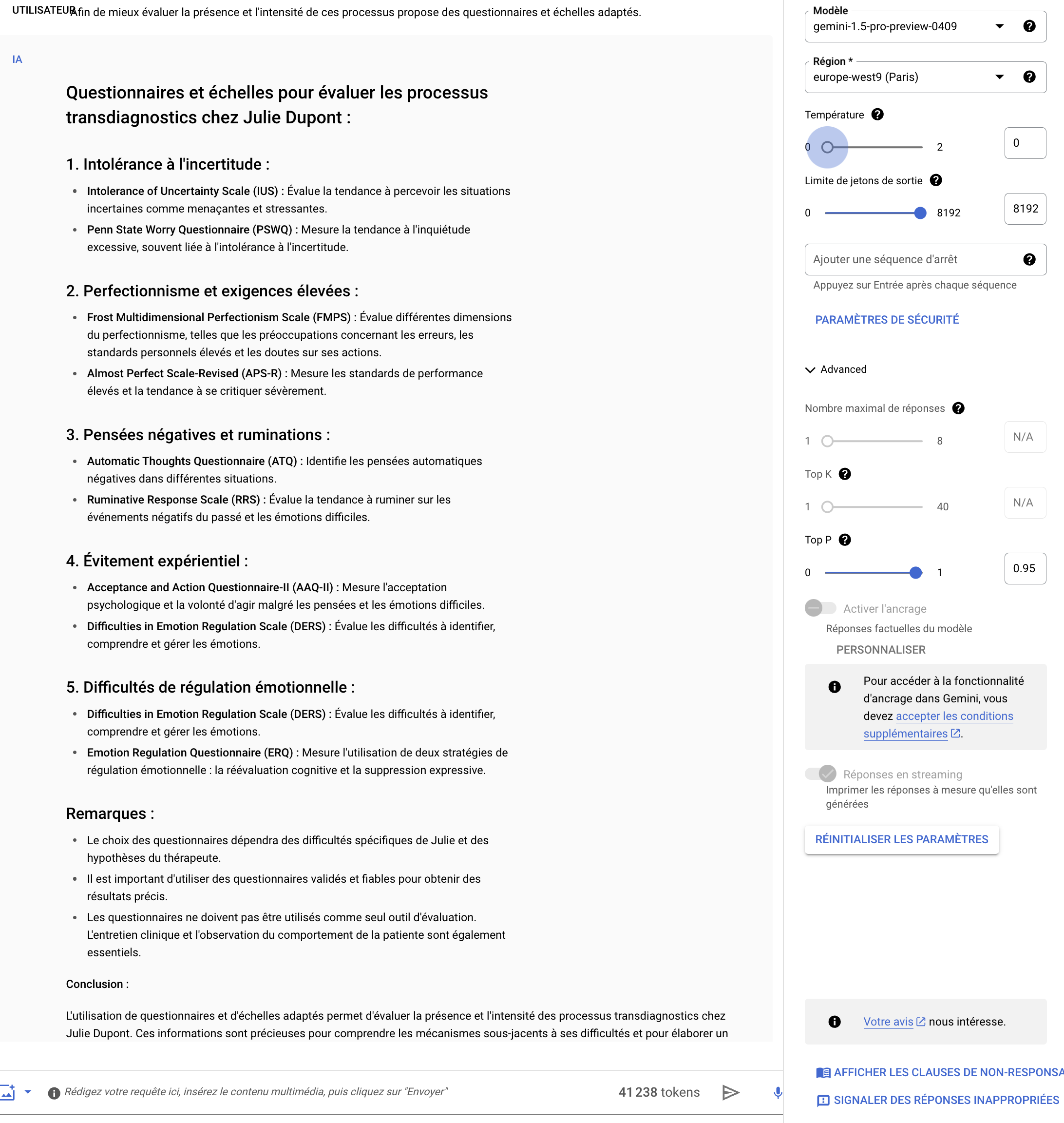 Il est important de noter que l'administration de tous ces questionnaires pourrait être fastidieuse et chronophage. Il serait judicieux de sélectionner les plus pertinents en fonction des observations cliniques et des priorités thérapeutiques identifiées avec Julie. De plus, l'utilisation de ces outils devrait toujours être complétée par une évaluation clinique approfondie pour une compréhension globale de la situation de Julie.