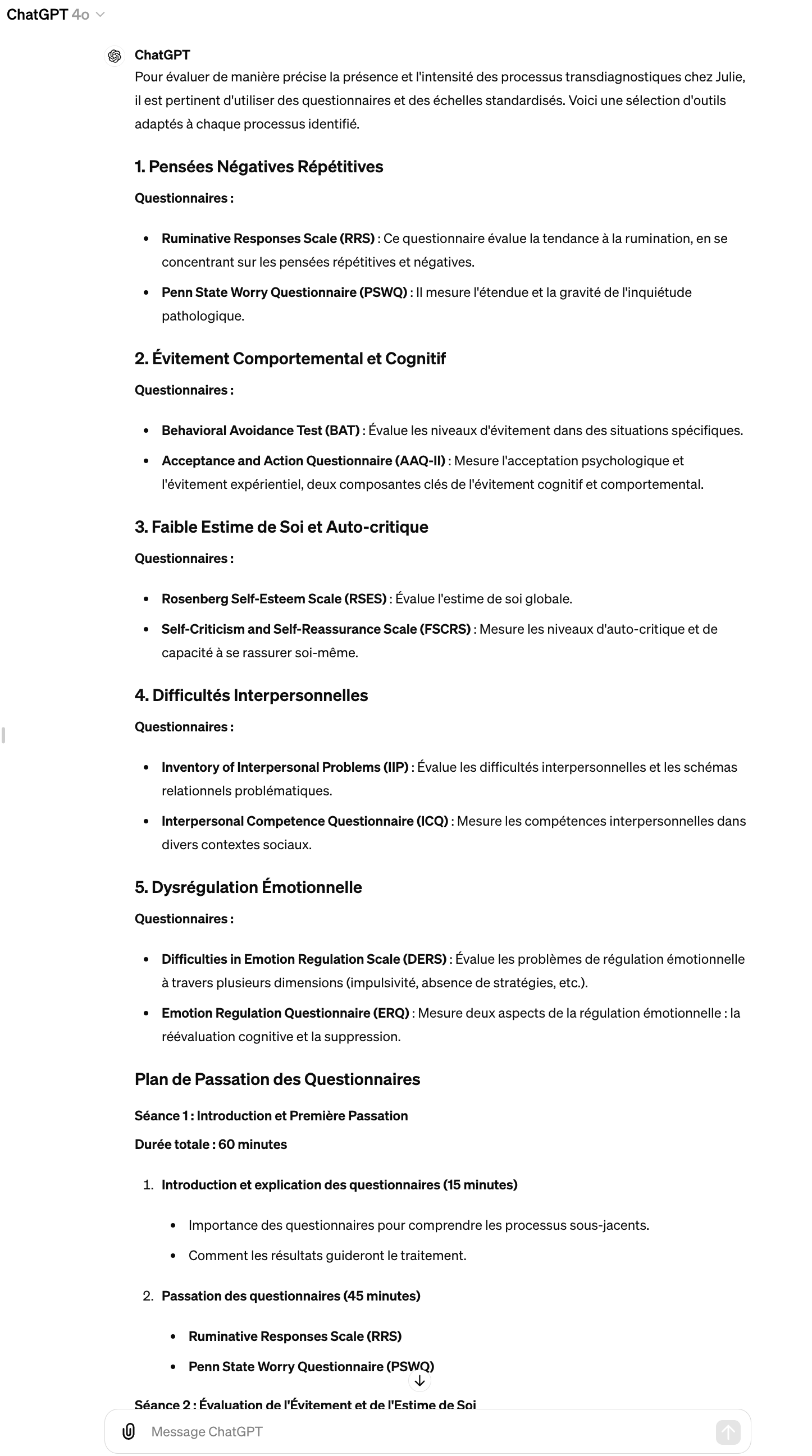 Ce plan de passation des questionnaires permettra d'évaluer en profondeur la présence et l'intensité des processus transdiagnostiques chez Julie. Les résultats obtenus guideront le traitement en identifiant les domaines spécifiques à cibler pour améliorer son bien-être global. N'hésitez pas à me faire part de vos questions ou préoccupations à tout moment.