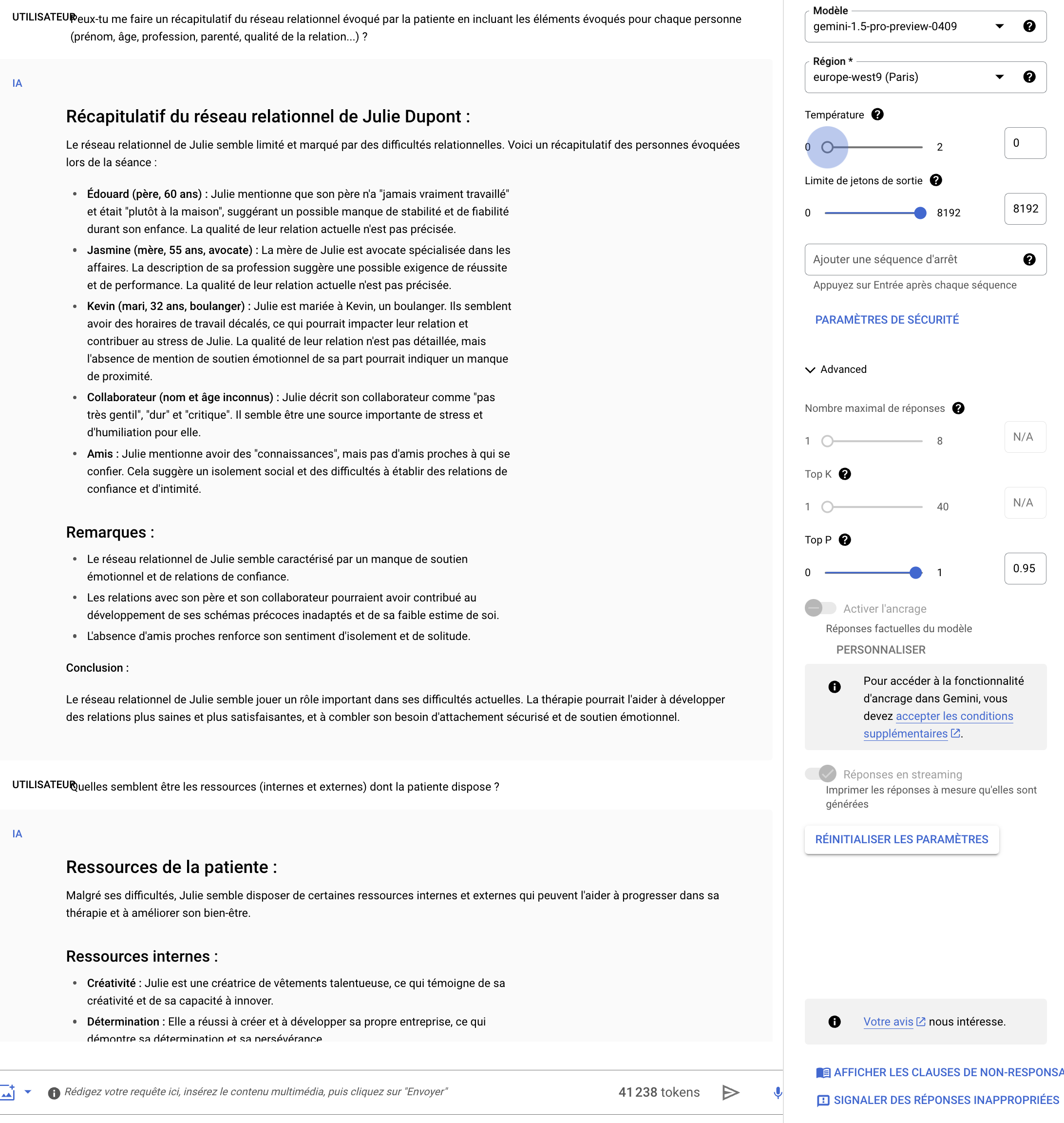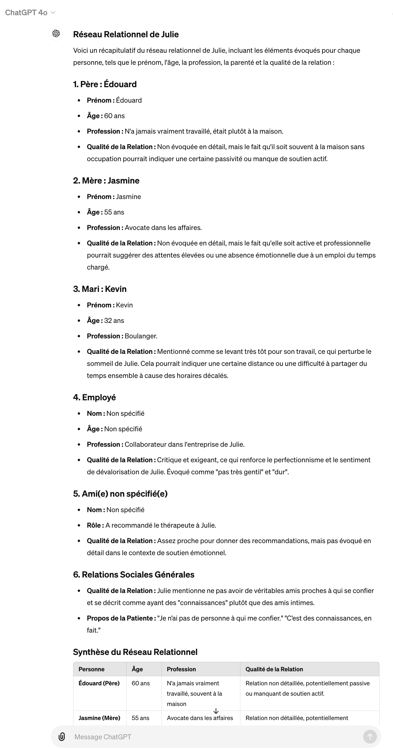 Capture d'écran de la réponseVoici un récapitulatif du réseau relationnel de Julie, incluant les éléments évoqués pour chaque personne, tels que le prénom, l'âge, la profession, la parenté et la qualité de la relation :