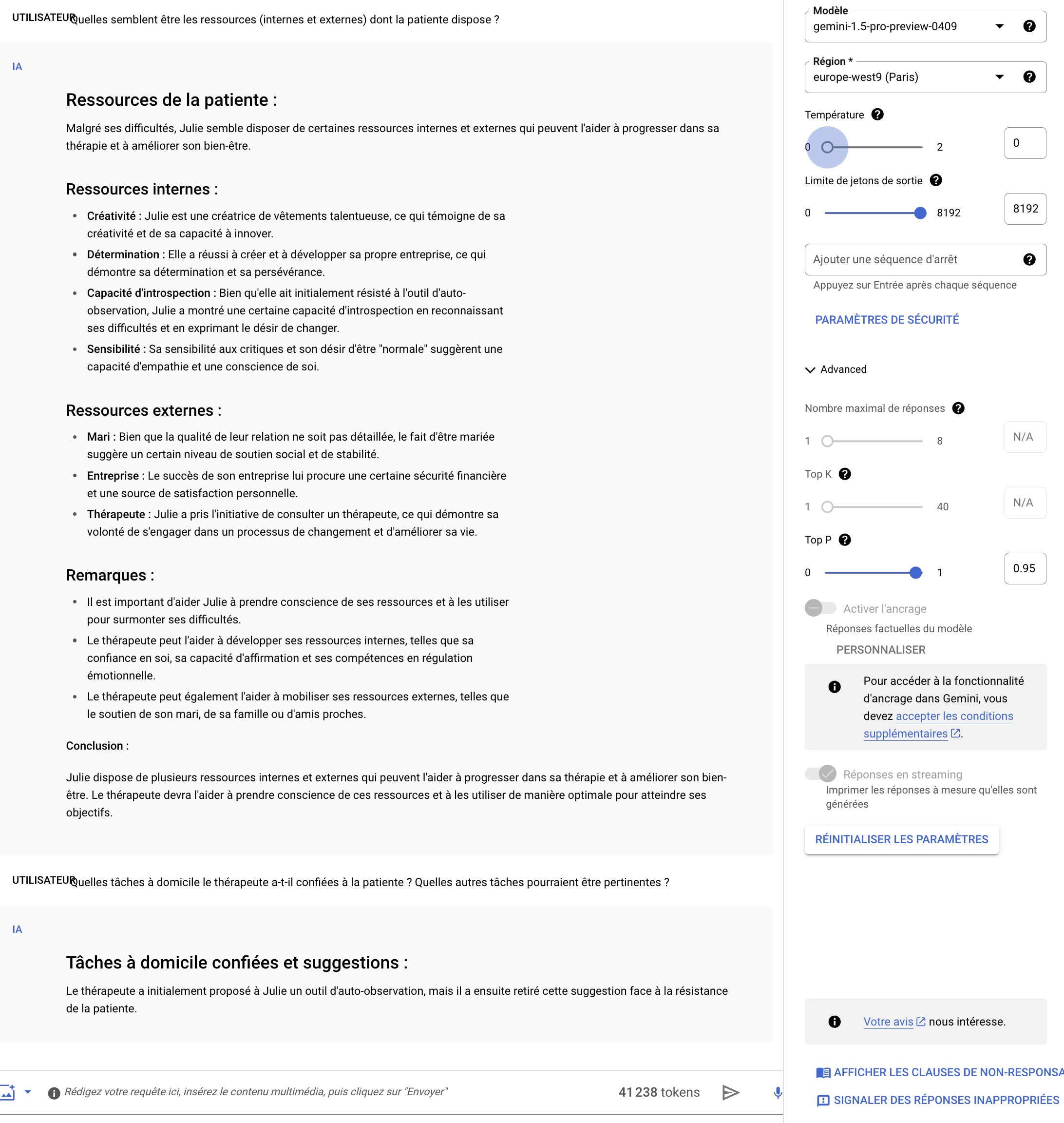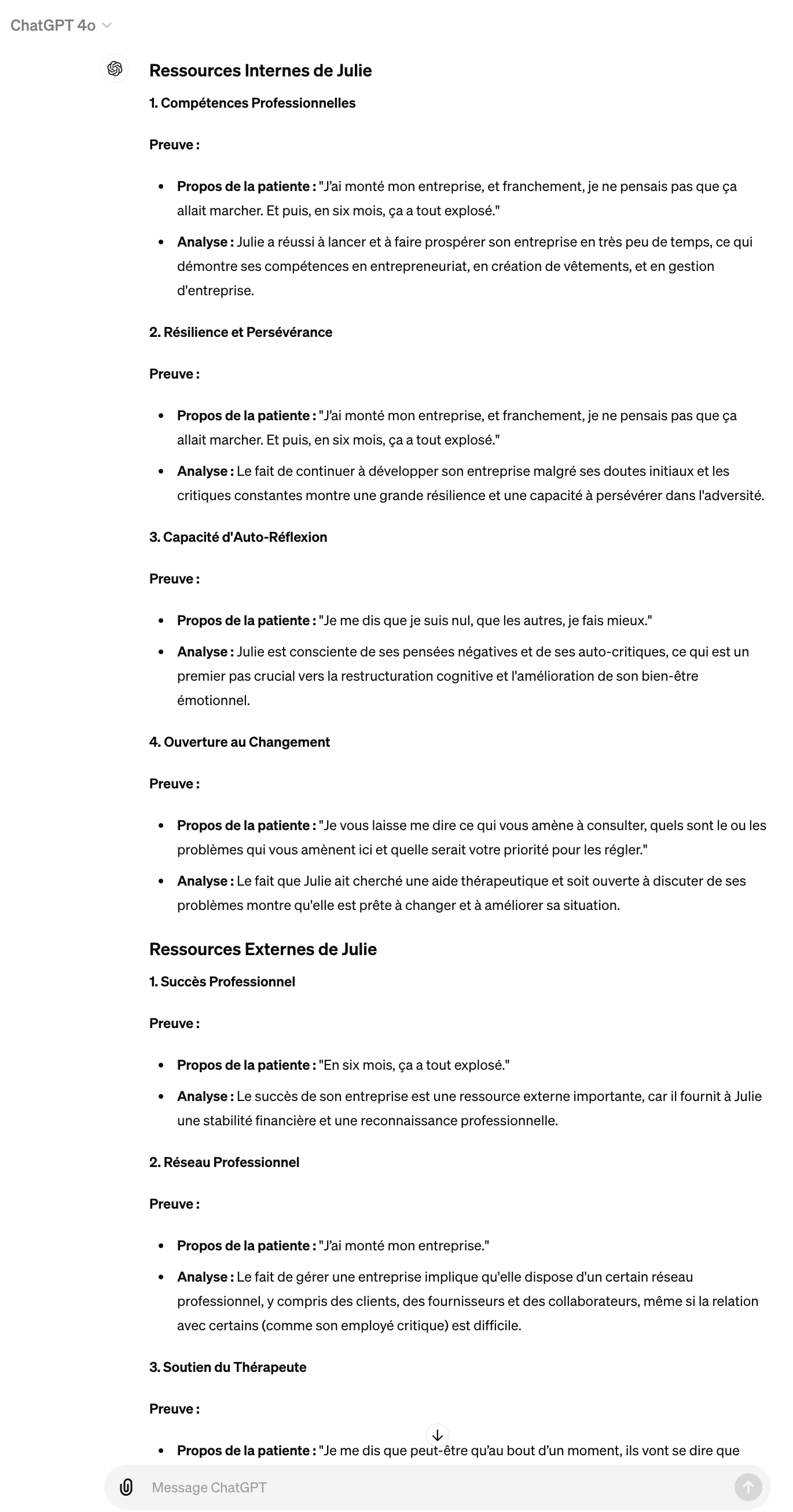 Capture d'écran de la réponseMalgré les difficultés évoquées par Julie, on peut identifier plusieurs ressources, tant internes qu'externes, qui pourraient être mobilisées dans le processus thérapeutique. Voici une analyse détaillée de ces ressources :