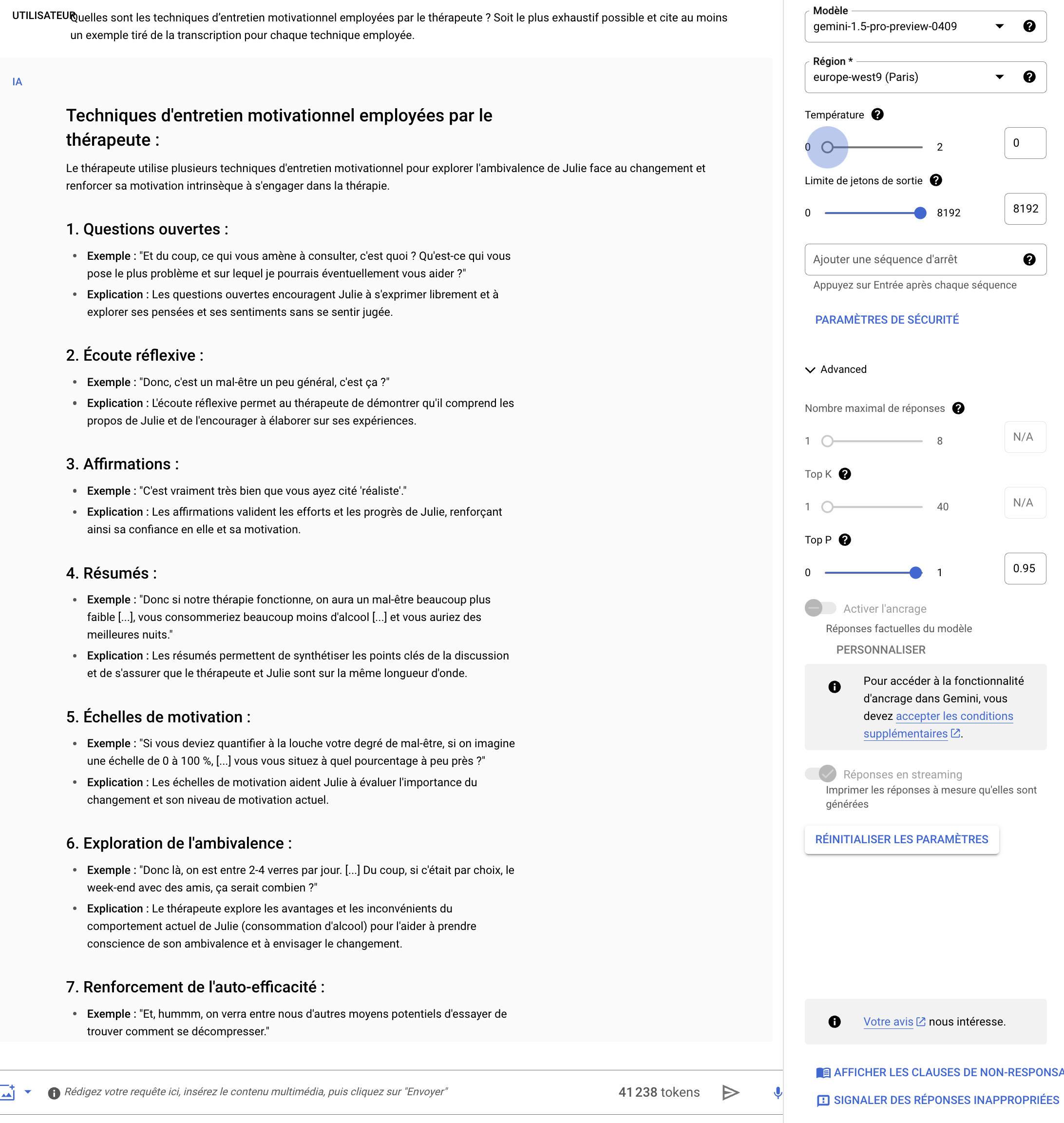 Capture d'écran de la réponseVoici une analyse exhaustive des techniques d'entretien motivationnel employées par le thérapeute, avec des exemples tirés de la transcription pour chaque technique :
