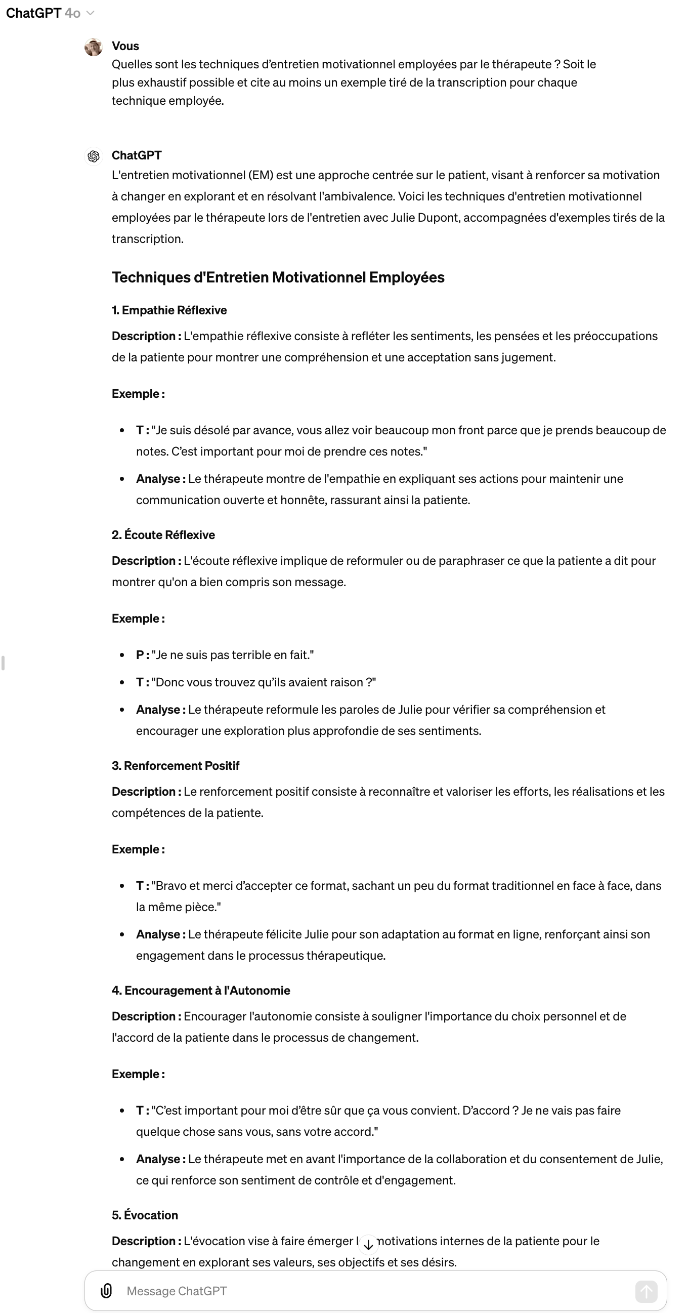 En examinant l'entretien, les techniques les plus fréquemment employées par le thérapeute sont l'empathie réflexive, le renforcement positif, et l'encouragement à l'autonomie. Ces techniques permettent de créer un cadre de thérapie basé sur la compréhension, la valorisation des efforts de la patiente et l'autonomie, ce qui est crucial pour établir une relation de confiance et pour motiver Julie à s'engager activement dans le processus de changement.