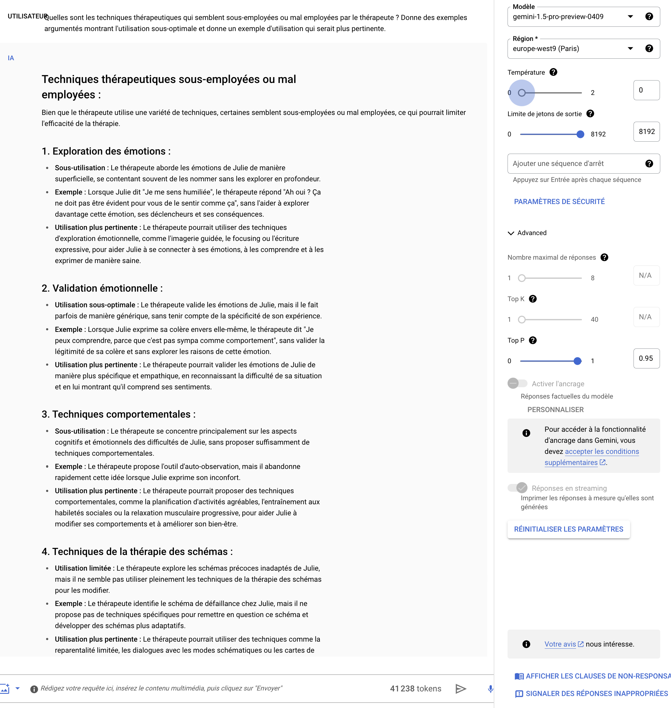Capture d'écran de la réponseVoici une analyse des techniques thérapeutiques qui semblent sous-employées ou mal employées par le thérapeute, avec des exemples argumentés et des suggestions d'utilisation plus pertinente :
