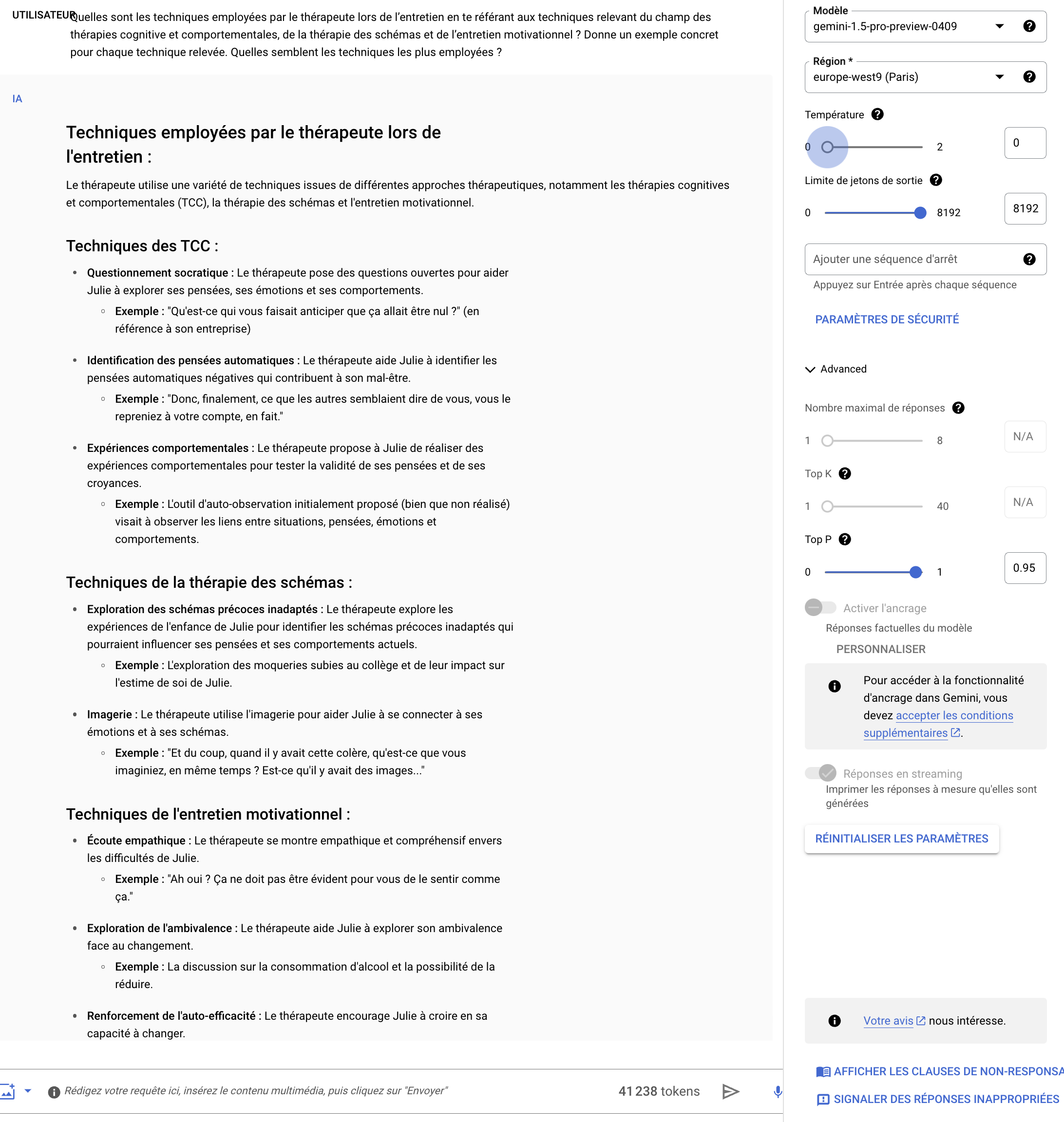 Capture d'écran de la réponseVoici une analyse des techniques employées par le thérapeute lors de l'entretien, en se référant aux champs des thérapies cognitives et comportementales (TCC), de la thérapie des schémas et de l'entretien motivationnel :