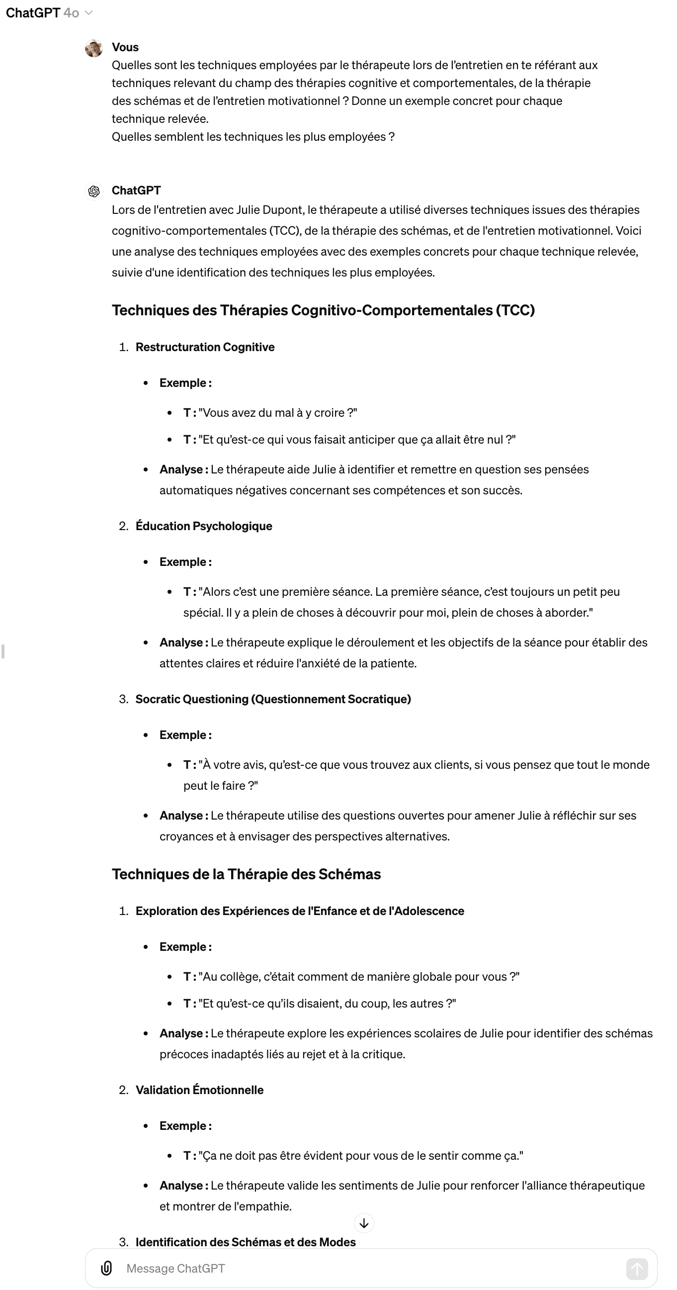 En analysant l'entretien, il semble que les techniques les plus employées par le thérapeute relèvent principalement de l'éducation psychologique, de la restructuration cognitive, et du questionnement socratique, toutes issues des thérapies cognitivo-comportementales. Ces techniques sont utilisées pour aider Julie à identifier, comprendre et modifier ses pensées négatives, ainsi que pour établir des attentes claires et un cadre sécurisant pour la thérapie.